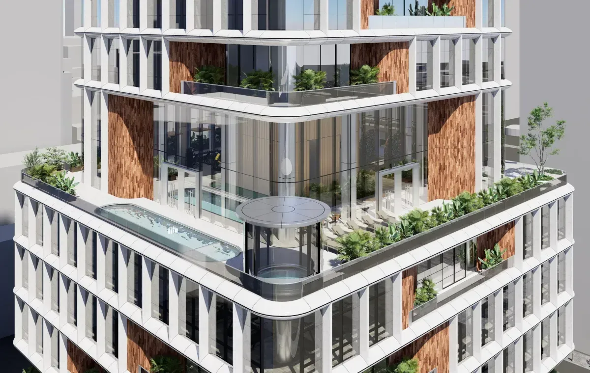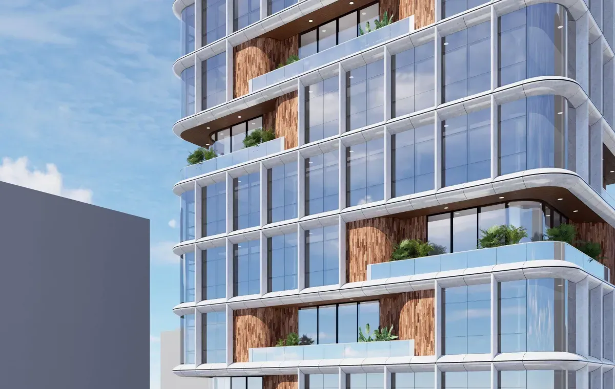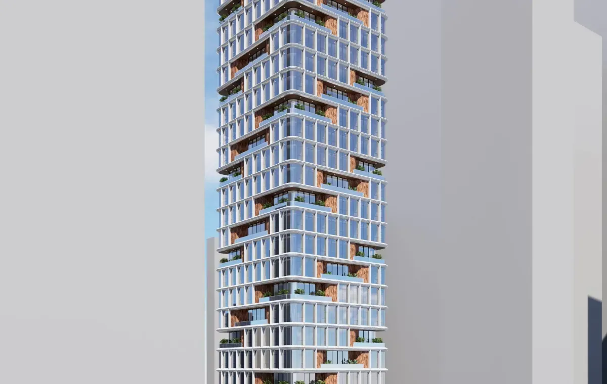 This mixed-use tower, seamlessly blending hotel and residential spaces, offers an inviting and vibrant vertical community. The architectural design expresses a sophisticated rhythm with its thoughtfully articulated facade. Vertical fins and staggered geometries bring depth and character to the building, creating a sense of movement and refinement as the eye travels up its height. The alternating materials of sleek glass and warm wood-toned panels provide a balanced aesthetic, making the building feel both modern and welcoming.
