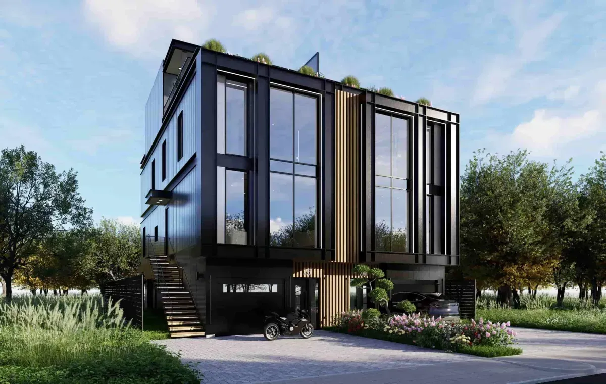 Roof Cap and Natural Light One of the standout features of the 3D-printed homes is the modular angled roof cap. This element is not only an aesthetic enhancement but also serves multiple functional purposes. The roof cap includes integrated skylights, which bring natural light into the homes, reducing the need for artificial lighting and enhancing the mental well-being of residents. Additionally, the roof cap houses solar panels, providing a renewable energy source that contributes to the sustainability of the homes. The design ensures that each housing module benefits from energy efficiency and a bright, uplifting living environment.