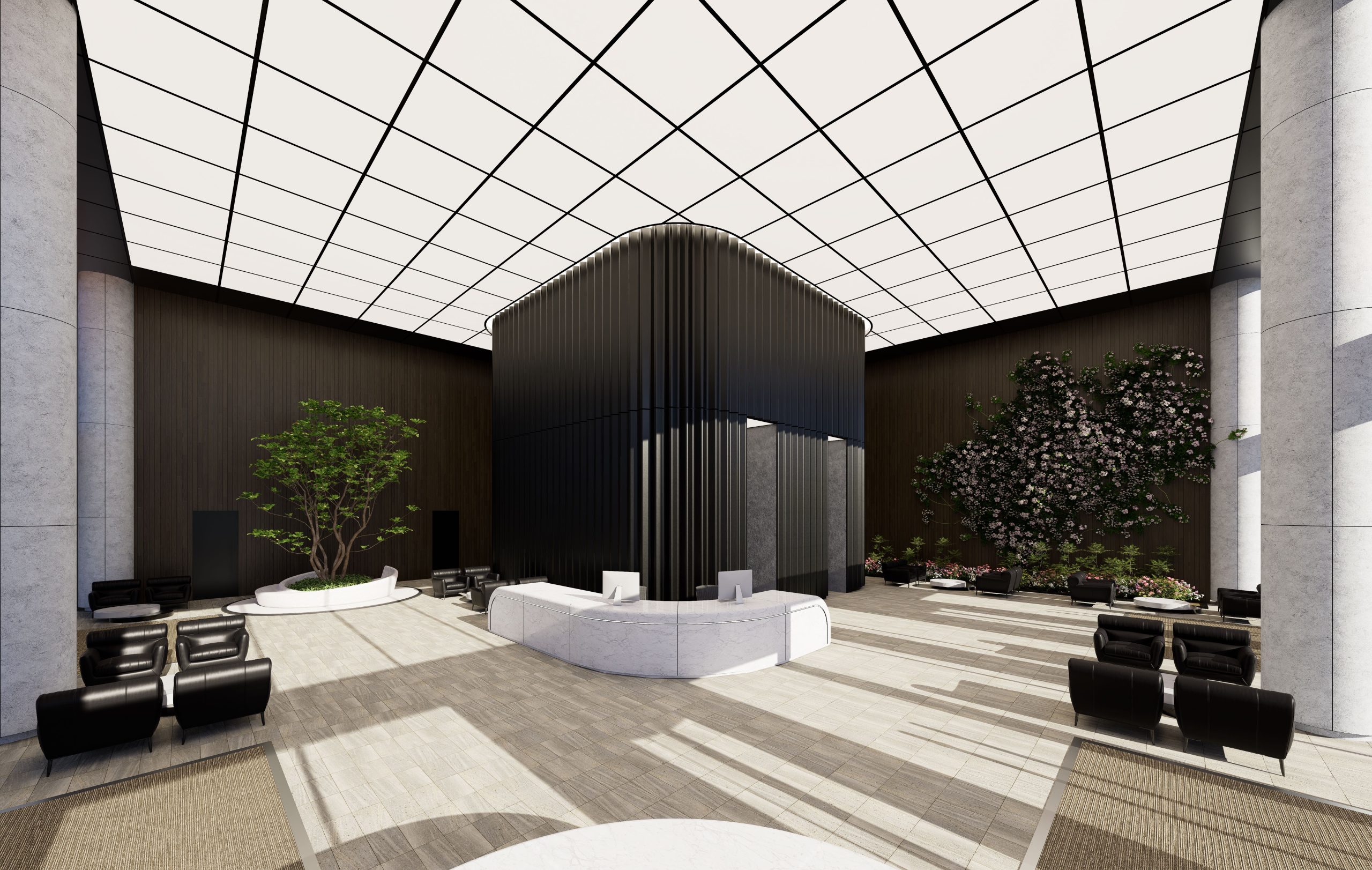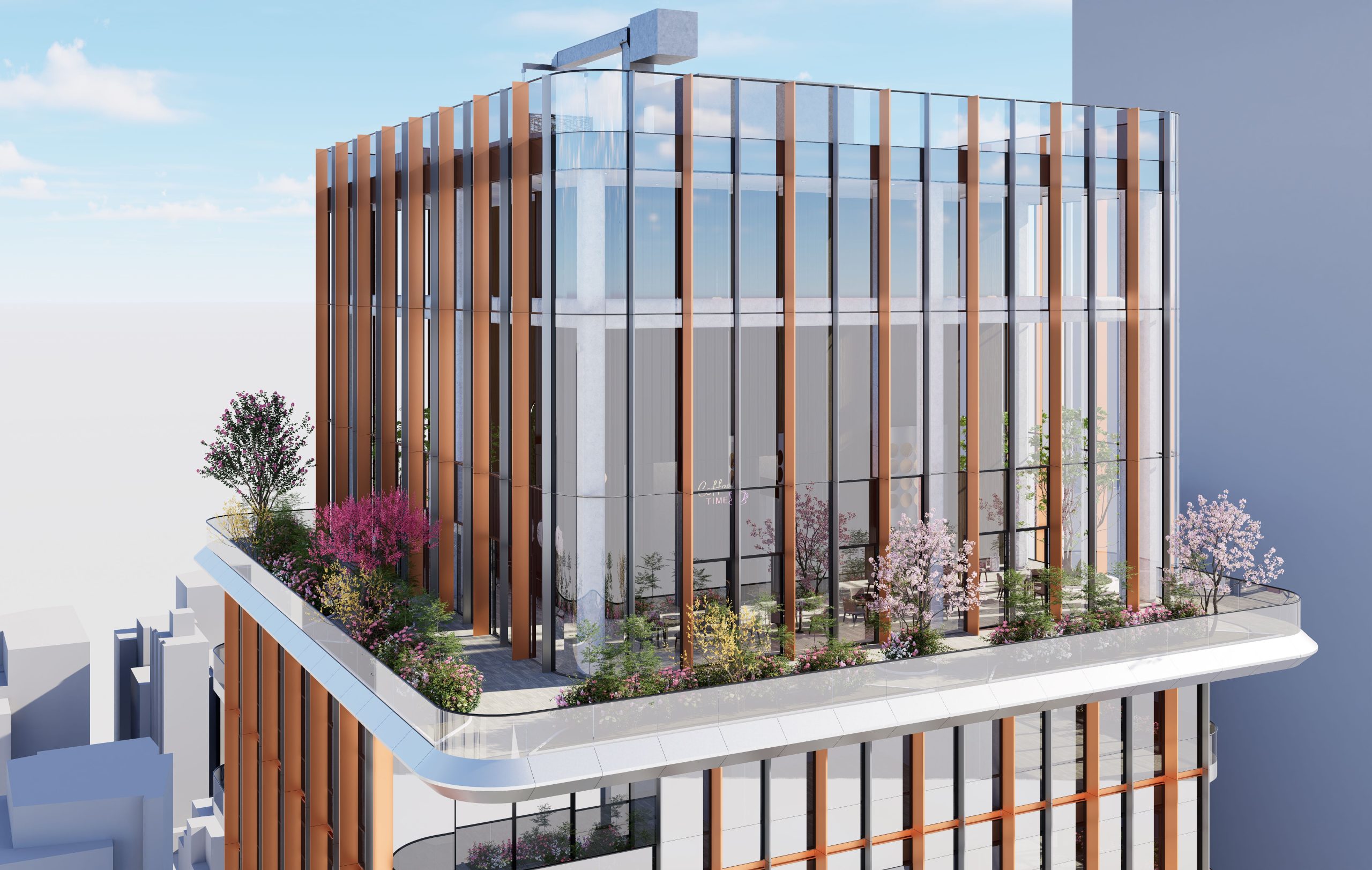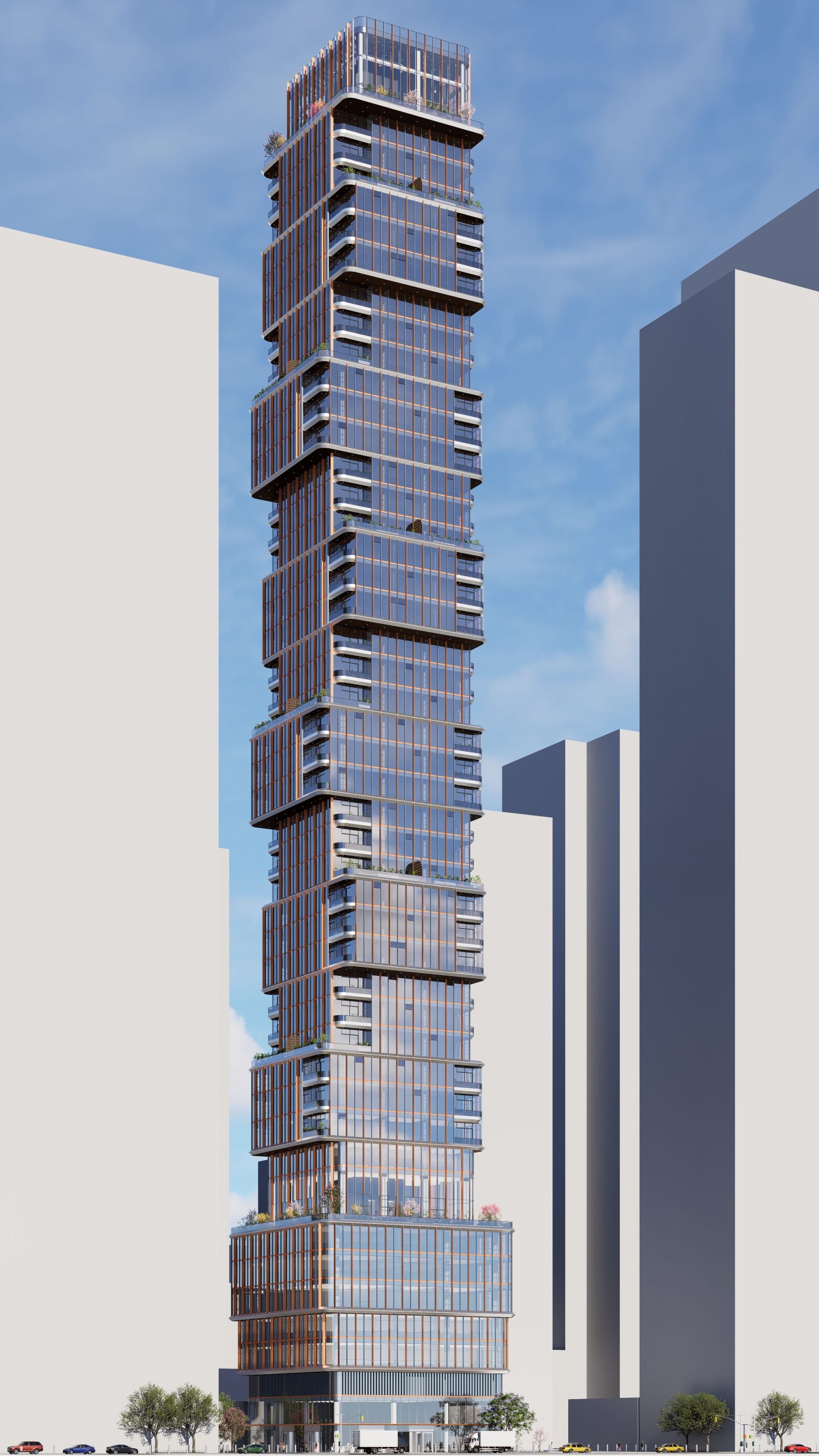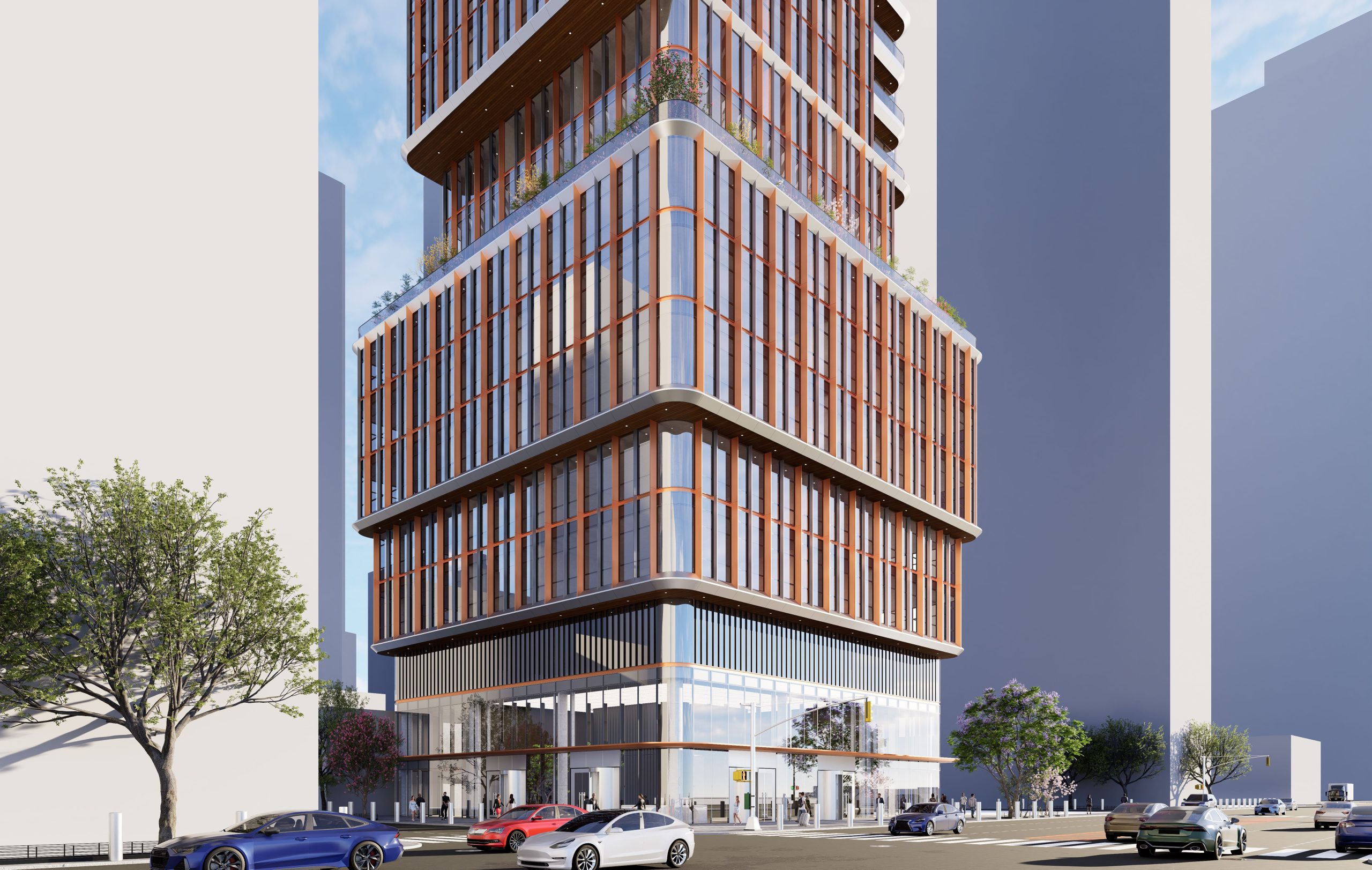 This mixed-use tower design, featuring both hotel and residential spaces, integrates advanced sustainability strategies and technical features, resulting in a structure that is both environmentally responsible and visually striking. The tower’s high-performance facade is enhanced with vertical copper fins, which serve a dual purpose: they minimize heat gain during warmer months and optimize daylighting, reducing the need for artificial lighting. Copper, a recyclable and durable material, contributes to the building’s sustainability goals, and its natural patina over time will give the facade a unique, evolving character.