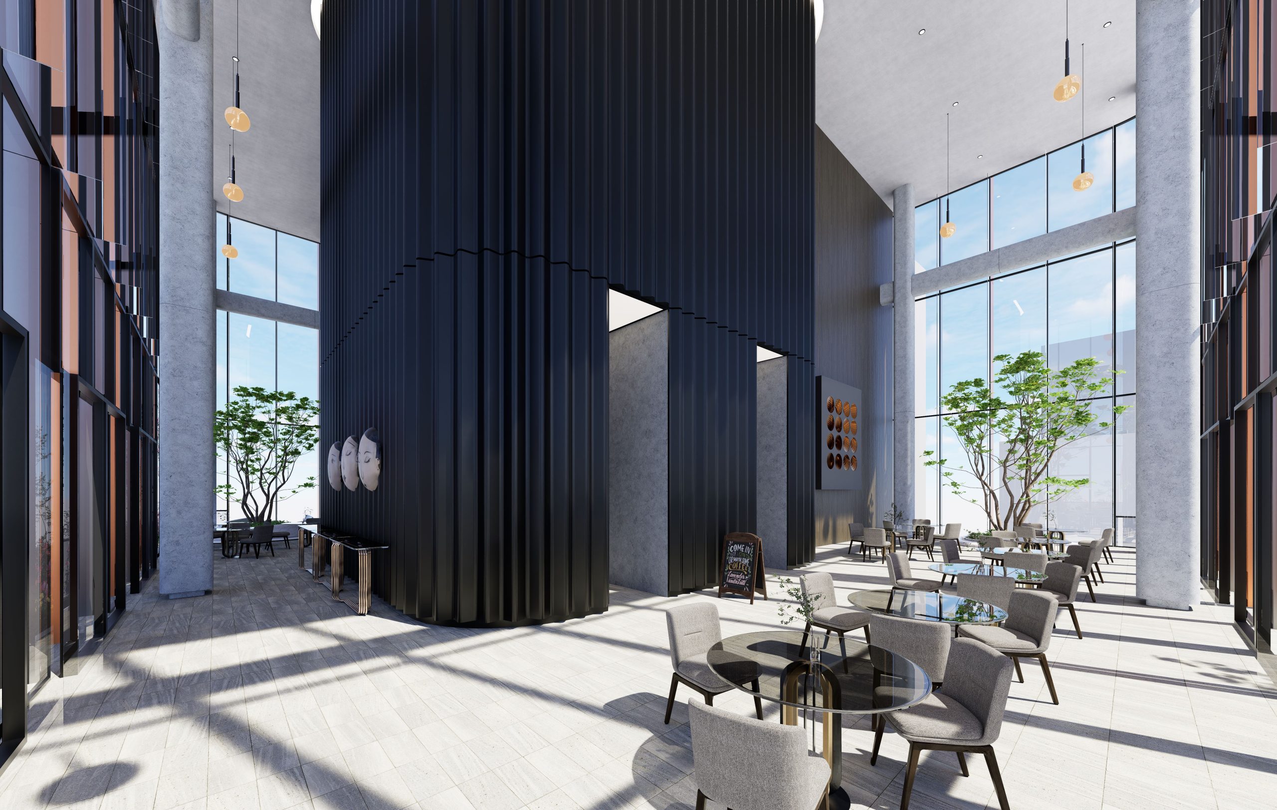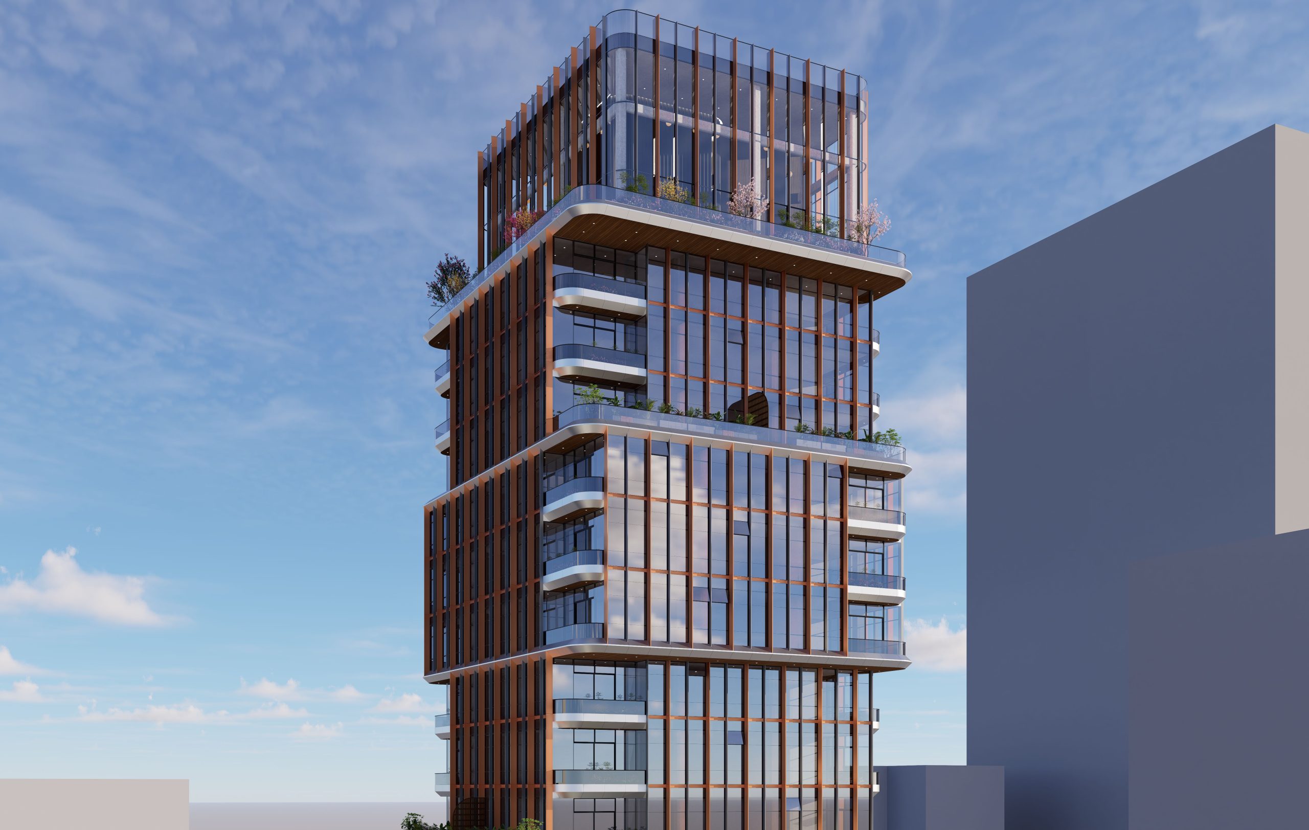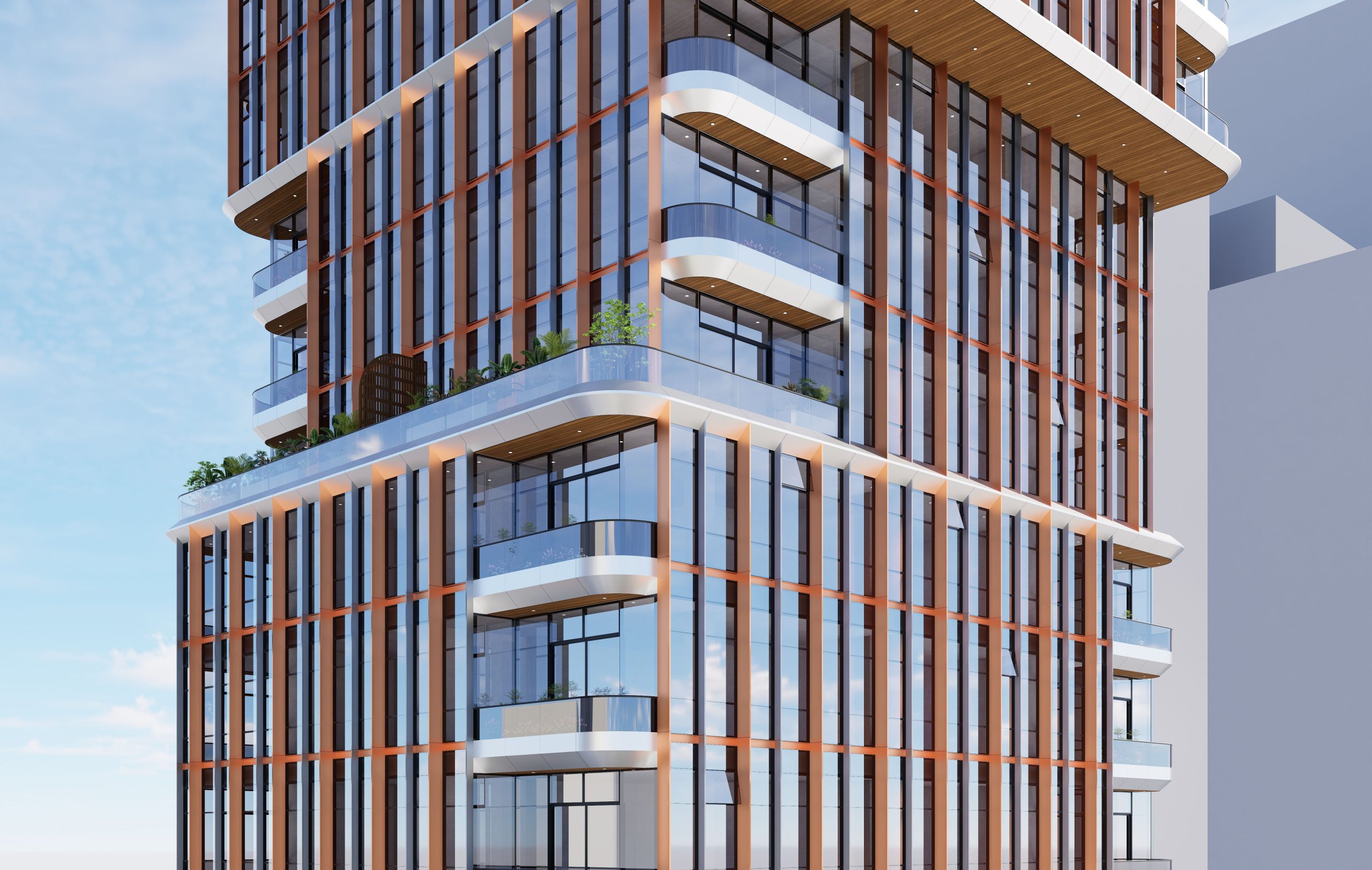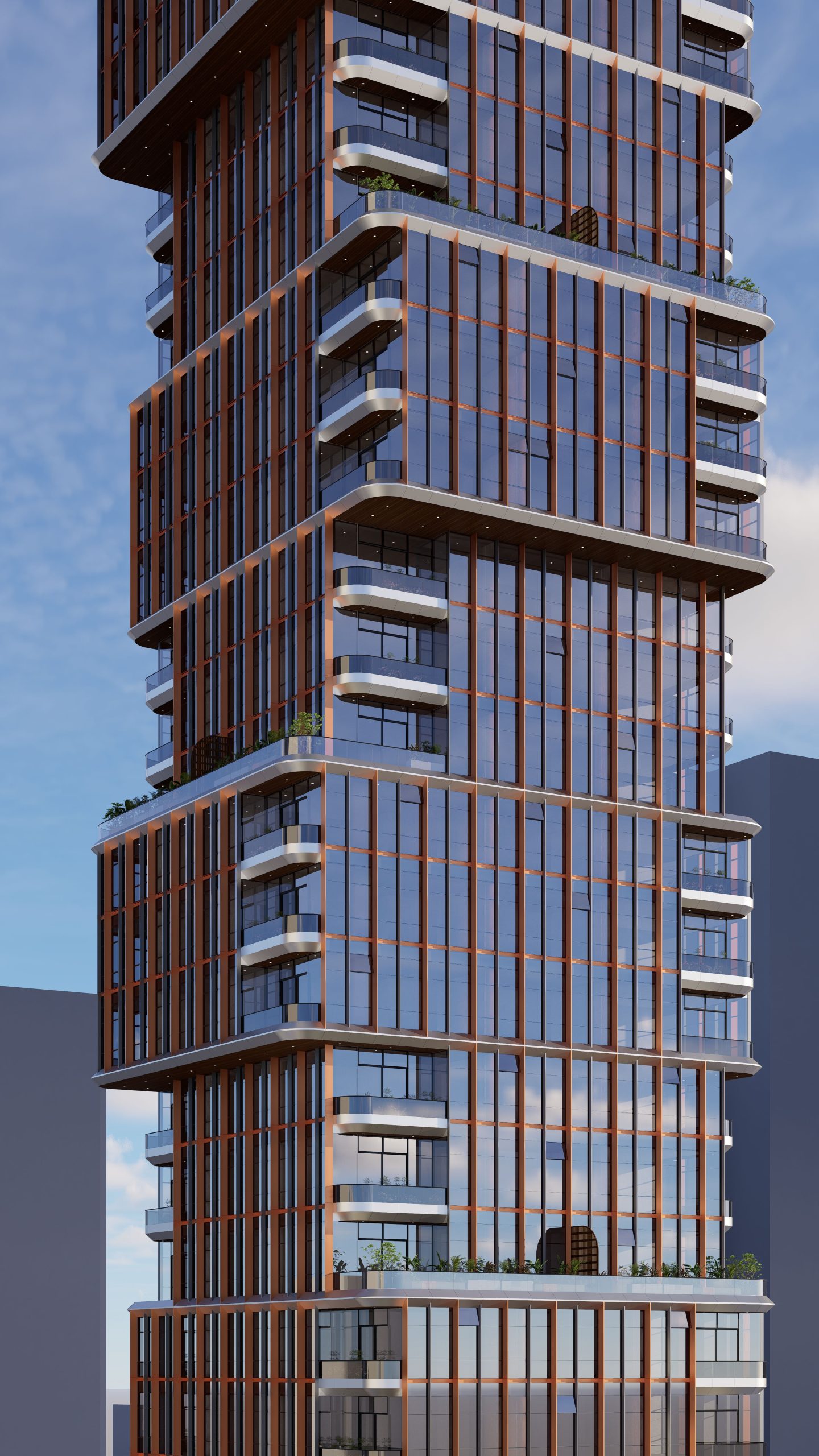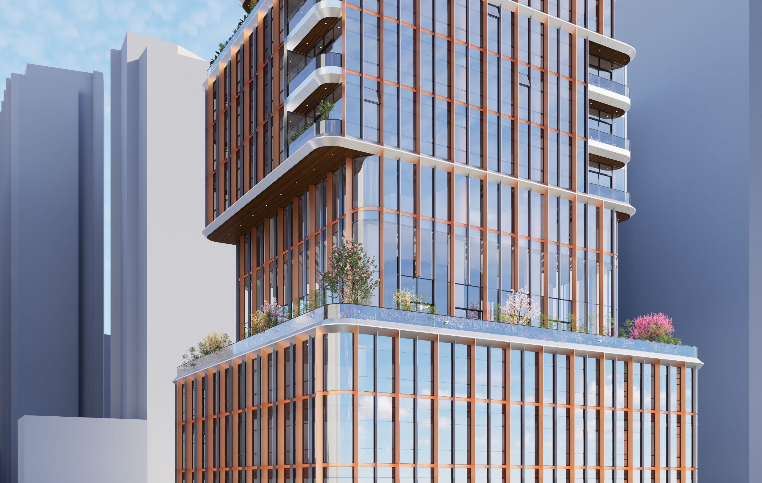 The facade’s vertical articulation, created by the rhythm of copper fins, not only adds a dynamic aesthetic but also emphasizes the building’s height, making it a distinctive presence in the urban skyline. The glass facade works in harmony with the copper fins, balancing transparency and thermal performance, while maximizing views and natural light for residents and hotel guests. This thoughtful facade design contributes significantly to the tower’s energy efficiency, enhancing occupant comfort while lowering operational costs.