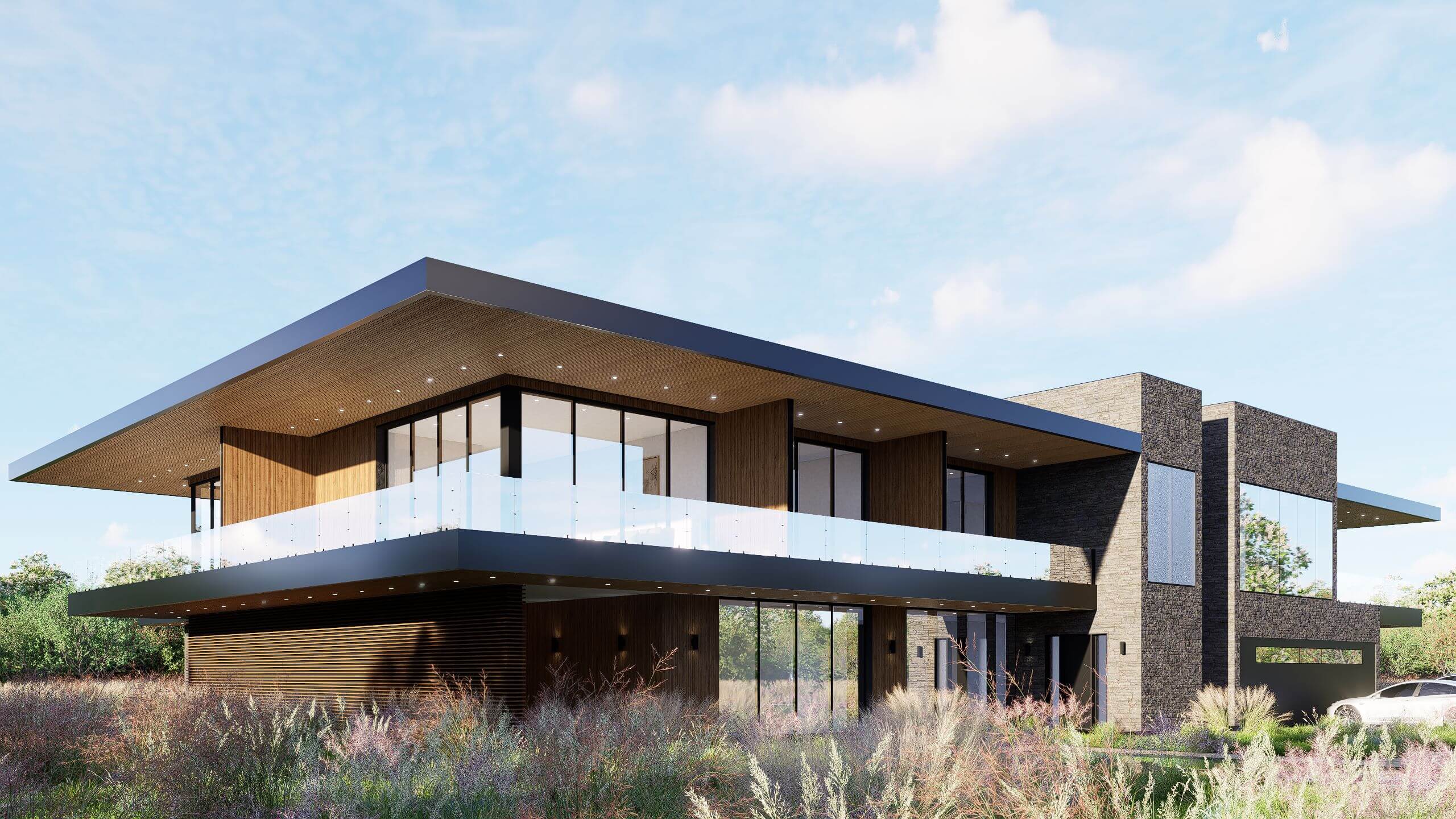 The distinctive roof design extends far, creating a long horizontal winged aesthetic that enhances the house’s architectural elegance.