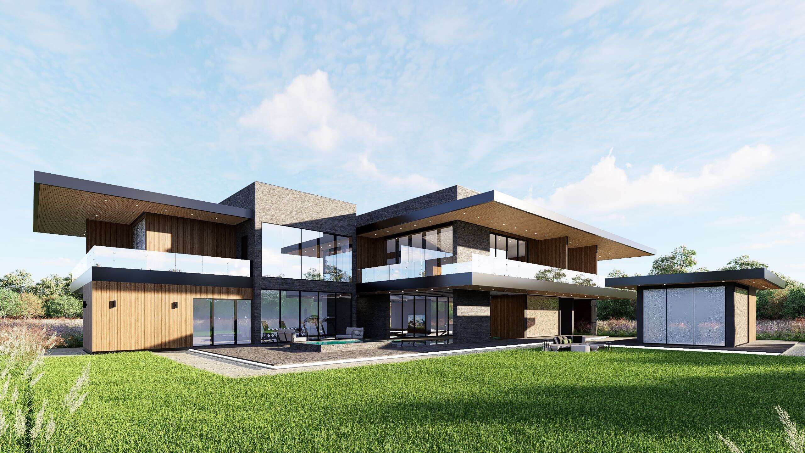 The wellness theme extends outdoors with a dedicated spa building, designed for ultimate relaxation and rejuvenation. The exterior is equally captivating, featuring a garden deck that appears to hover over a serene water feature. This tranquil water element seamlessly connects to a shimmering pool, creating a continuous flow of relaxation throughout the outdoor space. Additionally, a hot tub is integrated into the garden deck area, offering a perfect spot for unwinding.
